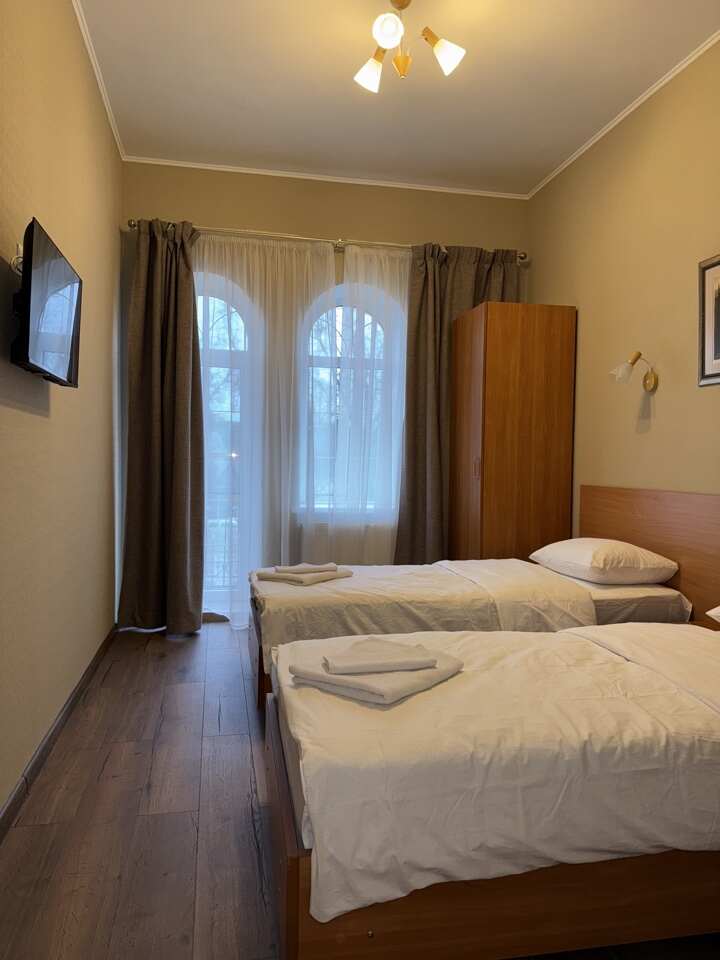 Светлый номер с телевизором, холодильником и собственной ванной комнатой.